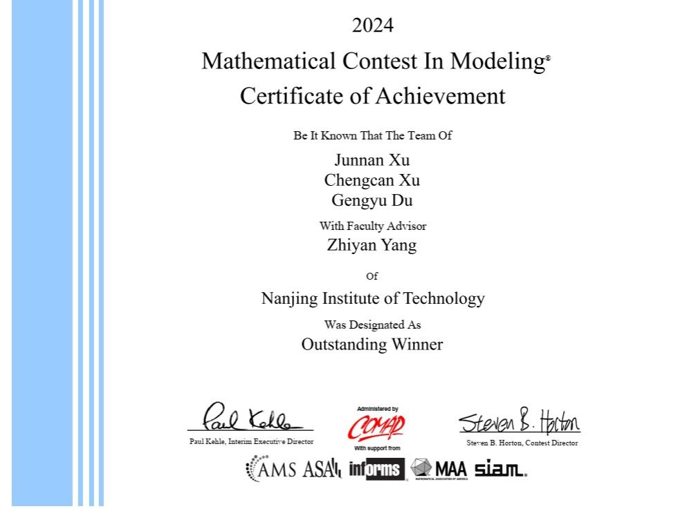 日前,2024年美国大学生数学建模竞赛(MCM/ICM)成绩揭晓。由我校数理学院杨芝艳老师指导,许俊楠、许诚粲、杜耕宇组成的团队荣获国际特等奖,这是凯发自参赛以来取得的最好成绩。同时,8支参赛队伍荣获国际二等奖,20支参赛队伍荣获国际三等奖,实现了参赛人数、获奖数量、获奖质量同步提升。