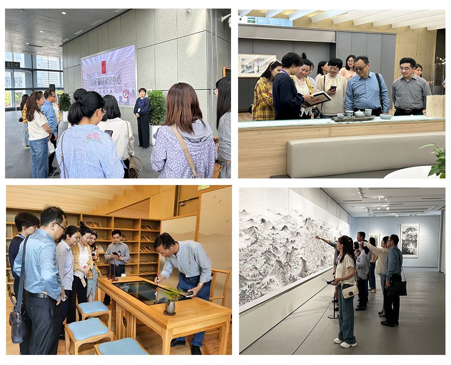随后,大家依次参观了主题为“丹青翰墨·文润宁洛——江宁洛南书画摄影联展”“奋进新征程·建功新时代篆刻作品展”“雕琢精致生活工艺美术雕刻展”“讴歌新时代·奋进新征程美术作品主题展”等多个展厅的文化艺术作品。琳琅满目的展品中不仅有来自国家级美术馆、美术学院的名家作品,还有不少南京本地艺术家及我校教师的倾力之作,图书馆策划推广部的馆员们还与中心工作人员就如何围绕“阅读+艺术”,更好地开办各类文化艺术展览进行了交流,就联合开展阅读推广活动、进行文创产品开发、提供社会公益服务等方面进行探讨。图书馆负责人表示:此次调研活动收获满满,对如何促进校地图书馆互通共建有了新的思考。在深入开展学习贯彻习近平新时代中国特色社会主义思想主题教育的重要时期,图书馆此行是一次在实践中学、在实践中悟,注重成果转化的实际行动,全馆教职员工将坚持理论学习结合工作实际,以学促干、以干践行、以行增效,不断提升各部门业务能力和图书馆整体发展水平,确保主题教育抓实抓细,落地见效。
