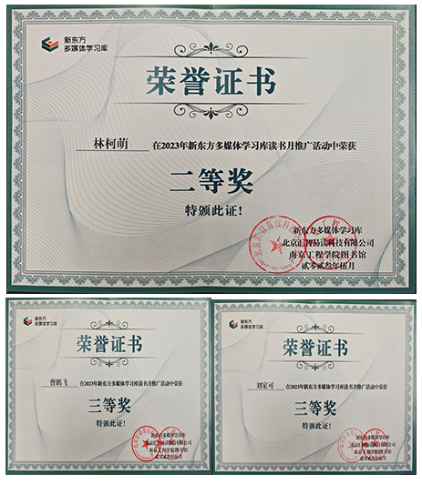 我校图书馆大力组织、宣传,广大读者积极参与,机械凯发林柯萌同学在活动中表现优秀喜获二等奖,计算机凯发刘家可、环境凯发曹鹏飞两位同学获得三等奖,我校图书馆获得优秀组织奖。